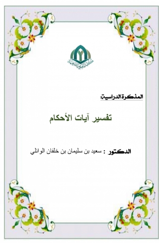 تناولت هذه المذكرة تفسير آيات الأحكام لغة واصطلاحاً، نشأة تفسير آيات الأحكام وتطورها وخصائصها وعددها، أشهر مؤلفي تفاسير آيات الأحكام ومناهجهم، قواعد لغوبة تفسير آيات الأحكام، قواعد أصولية في تفسير آيات الأحكام، أحكام الذبائح والضرورات (البقرة 172-173)، أحكام القتال (البقرة 190- 194)، أحكام الرضاع (البقرة 233)، أحكام صلاة الخوف و السفر (النساء 101)، أحكام الزينة (الأعراف 32-33)، أحكام الغنائم (الأنفال 41)