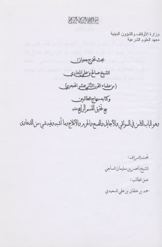 تحقيق القسم الرابع من كتاب منهج الطالبين: الباب الثامن في السواقي و الأجايل و الفسح و الحرم و الأفلاج و ما أشبه و فيه شيء من الدعاوى الباب الأول : الحياة السياسية في عصر المؤلف، الحياة الاجتماعية، الحياة العلمية و الثقافية، الحياة الاقتصادية، الفصل الثاني : حياة المؤلف، الباب الثاني : دراسة الكتاب