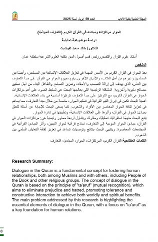 يعد الحوار في القرآن الكريم من الأسس المهمة في تعزيز العلاقات الإنسانية بين المسلمين، وأيضا بين المسلمين وغيرهم من أهل الكتاب والأديان الأخرى. يقوم مفهوم الحوار في القرآن على مبدأ التعارف بين الناس، الذي يهد إلى إزالة التعصب والأحقاد وتعزيز التسامح والتفاعل البناء من أجل تحقيق مصالح دنيوية وأخروية. المشكلة الرئيسية التي يعالجها البحث هي تسليط الضوء على أهم مرتكزات الحوار في القرآن الكريم، مع التركيز على مبدأ التعارف كركيزة أساسية في بناء العلاقات الإنسانية. أهمية البحث تكمن في إبراز القيم القرآنية في تنظيم الحوار، خاصة من خلال مبدأ التعارف، مما يساهم في تعزيز ثقافة الحوار المعاصر بين الأفراد والشعوب. كما يسعى البحث للإجابة عن أسئلة تتعلق بمبادئ الحوار في القرآن، وأثرها على العلاقات الإنسانية، وتطبيقها في إدارة الحوار، يتبع البحث منهجا استقرائيا، تحليليًا، ومقارنا، ويتناول أربعة محاور رئيسية هي: مرتكزات الحوار في القرآن، مبادئ الحوار المؤدية إلى التعارف، نماذج قرآنية لحوار النبيين، وأثر المبادئ القرآنية في المجتمعات المعاصرة. وينتهي البحث بنتائج وتوصيات تساعد في تعزيز ثقافة التعايش السلمي بين الشعوب.