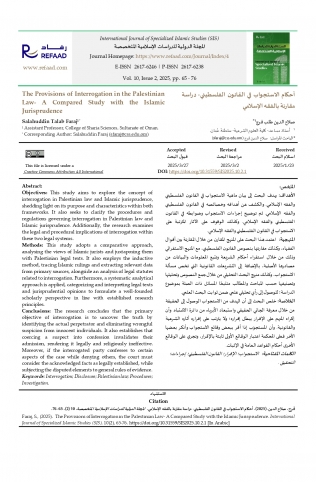 الأهداف: يهدف البحث إلى بيان ماهية الاستجواب في القانون الفلسطيني والفقه الإسلامي. والكشف عن أهدافه وخصائصه في القانون الفلسطيني والفقه الإسلامي. ثم توضيح إجراءات الاستجواب وضوابطه في القانو الفلسطيني والفقه الإسلامي. وكذلك الوقوف على الآثار المترتبة على الاستجواب في القانون الفلسطيني والفقه الإسلامي. المنهجية اعتمد هذا البحث على المنهج المقارن من خلال المقارنة بين أقوال الفقهاء، وكذلك مقارنتها بنصوص القانون الفلسطيني، مع المنهج الاستقرائي وذلك من خلال استقراء أحكام الشريعة وتتبع المعلومات والبيانات من مصادرها الأصلية، بالإضافة إلى التشريعات القانونية التي تخص مسألة الاستجواب، وكذلك منهج البحث التحليلي من خلال جمع النصوص وتحليلها وتصنيفها حسب المباحث والمطالب متتبعا المسائل ذات الصلة بموضوع الدراسة؛ للوصول إلى رأي تحليلي علمي ضمن ثوابت البحث العلمي. الخلاصة: خلص البحث إلى أن الهدف من الاستجواب الوصول إلى الحقيقة من خلال معرفة الجاني الحقيقي واستبعاد الأبرياء من دائرة الاشتباه. وأن إكراه المتهم على الإقرار يبطل إقراره؛ ولا يترتب على إقراره آثاره الشرعية والقانونية. وأن المستجوب إذا أقر ببعض وقائع الاستجواب وأنكر بعضها الآخر فعلى المحكمة اعتبار الوقائع الأولى ثابتة بالإقرار، وتجري على الوقائع الأخرى أحكام القواعد العامة في الإثبات.