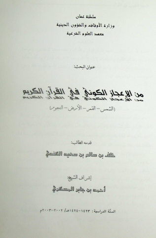 الفصل الأول : ماهية الإعجاز الكوني، الفصل الثاني : قضايا عامة في الإعجاز الكوني، الفصل الثالث : الشمس، الفصل الرابع : القمر، الفصل الخامس : الأرض